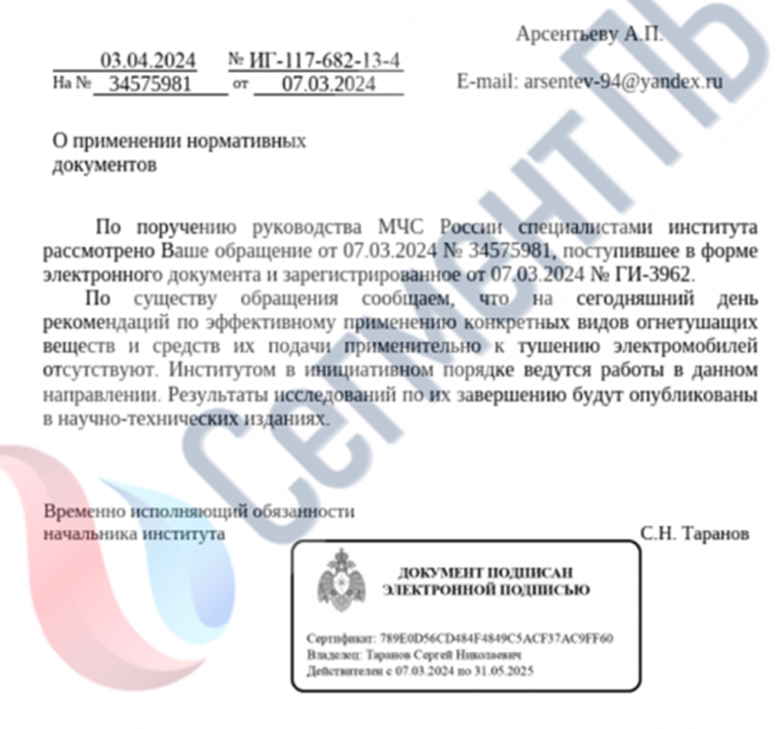 Также рекомендации по эффективному применению конкретных видов огнетушащих веществ и средств их подачи применительно к тушению электромобилей отсутствуют (Ответ ВНИИПО по вопросу способа пожаротушения электромобилей (№ИГ-117-682-13-4 от 03.04.2024)).