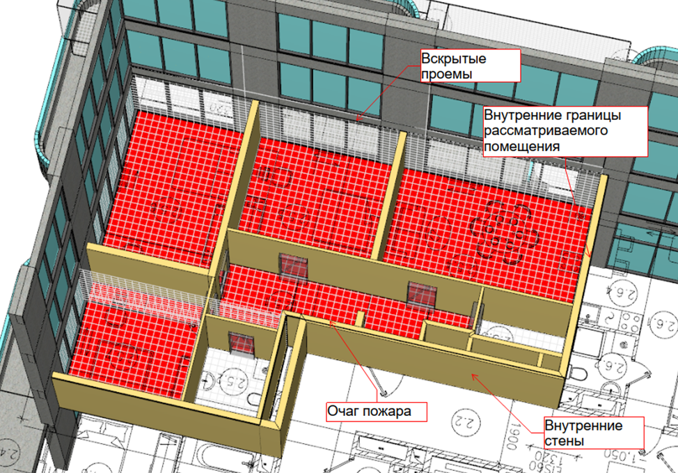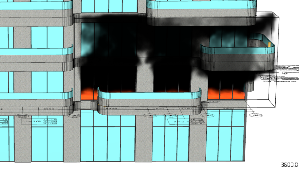 Расстояние между верхней границей остекления 2-го этажа и нижней границей остекления 3-го этажа (междуэтажный пояс) принято равным 0,65м. В модель включены помещение пожара и часть окружающего пространства снаружи фасада зданий от пола 2-го этажа до перекрытия 3-го этажа Объекта. Время моделирования принято равным с запасом 3600 с (60 мин).