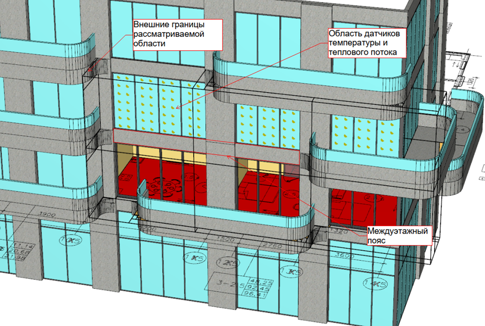 Рисунок 1. Внешний вид модели (фасад), красный контур – противопожарный междуэтажный пояс, черный контур – границы рассматриваемой области, желтыми точками – датчики температур и теплового потока.Для управления расчетом и получения данных использовались следующие измерители:
