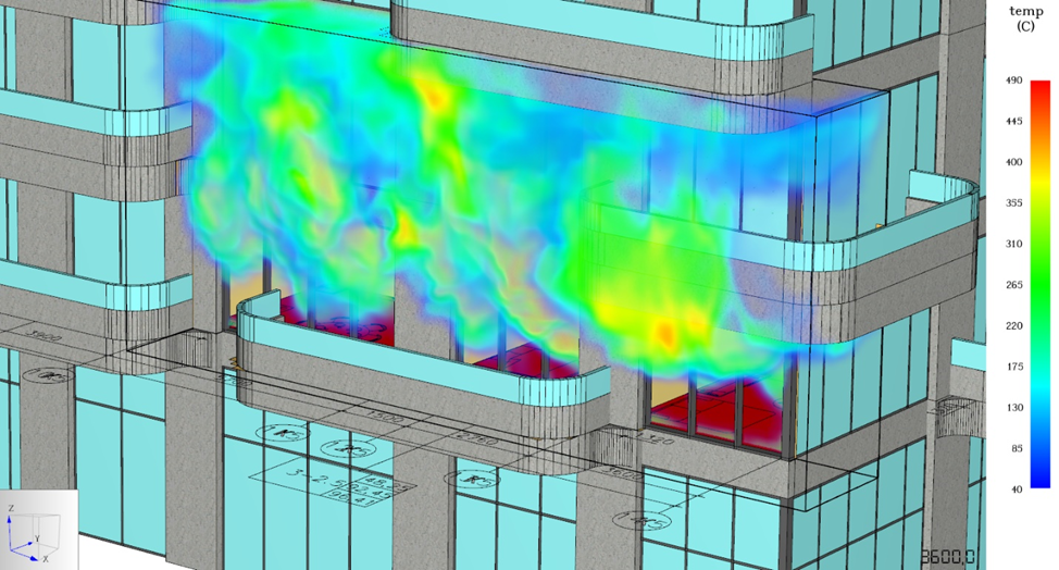 Для обоснования сокращения междуэтажного пояса менее 1,2 м следует использовать метод полевого моделирования. Моделирование выполняется программой FDS (Fire Dynamic Simulation) с использованием графического интерфейса Pyrosim, с выдачей заключения научно-исследовательского института МЧС.
