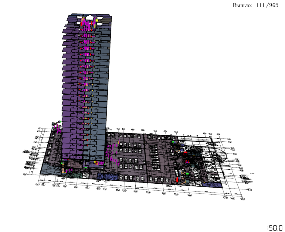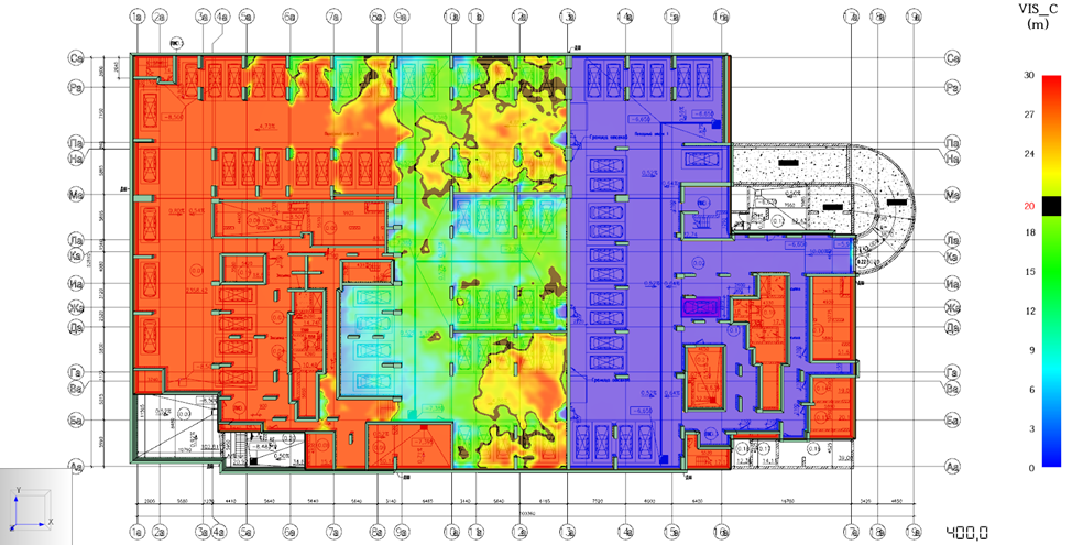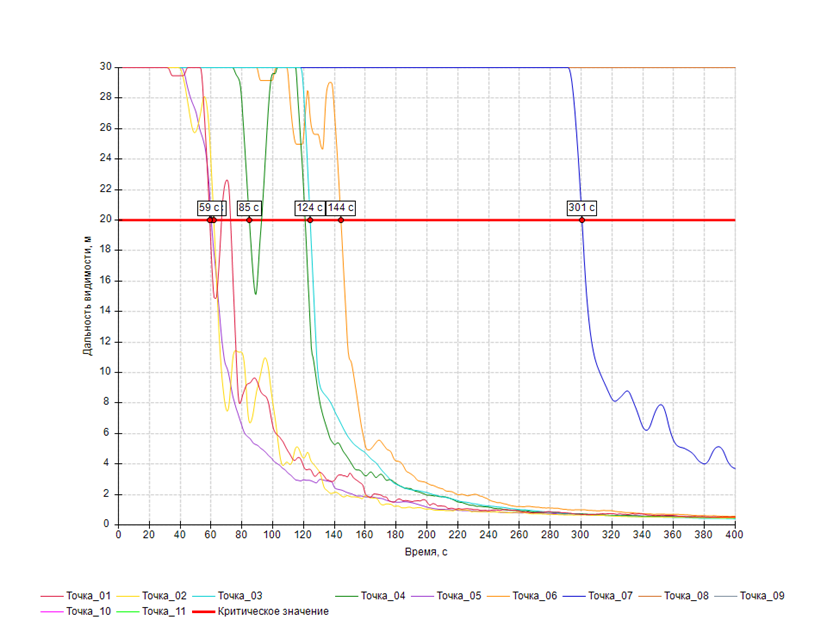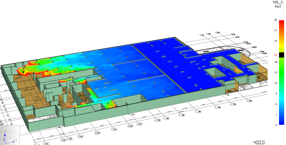 Пример визуализации результатов расчета времени эвакуации:На основе исходных данных формируется математическая модель развития пожара и динамика его развития. Эти расчеты позволяют построить поле опасных факторов, определить время до блокирования путей эвакуации людей.