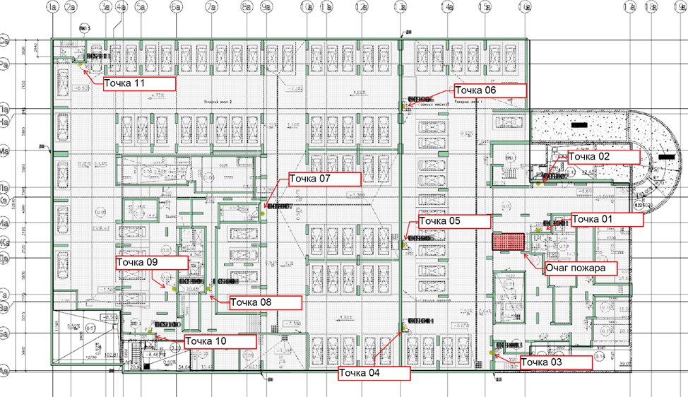 Построение полей опасных факторов пожара:Определение вероятности эвакуации людей и значения пожарного риска:Для каждого рассмотренного сценария развития пожара определяется вероятность эвакуации людей и значение индивидуального пожарного риска. Значение индивидуального пожарного риска для здания в целом принимается равным максимальному из значений пожарного риска для рассмотренных сценариев.