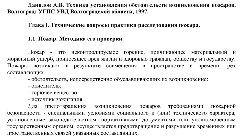 Данилов А.В. Техника установления обстоятельств возникновения пожаров. Волгоград: УГПС УВД Волгоградской области, 1997.