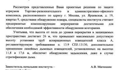 Рассмотрев представленные Вами проектные решения по защите атриумов Торгово-развлекательного и административно-офисного комплекса, расположенного по адресу г. Москва, ул. Ярцевская, д. 19, квартал 9, средствами обнаружения пожара, специалисты института считают предпринятые компенсирующие мероприятия достаточными для обеспечения необходимой эффективности обнаружения возгорания.